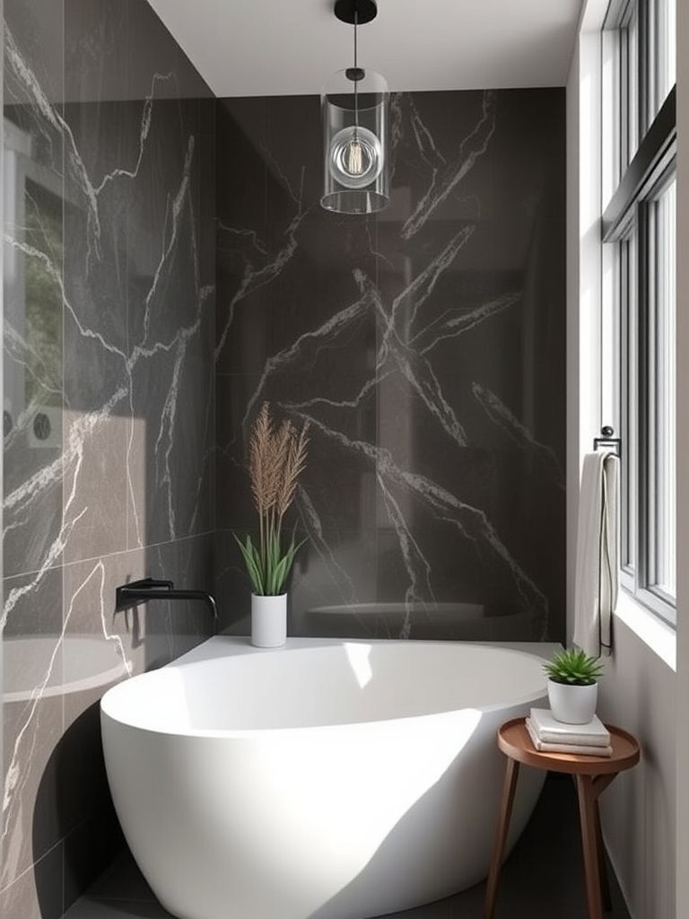 This bathroom stands out with its bold black and white mosaic tile flooring that creates a striking contrast, reminiscent of a moonlit desert landscape. The sleek black fixtures and white walls provide a modern, minimalist aesthetic, making this space uniquely dramatic yet budget-friendly. It would suit someone with a flair for contrast and a love for the dramatic, offering a sophisticated retreat that feels both luxurious and accessible.