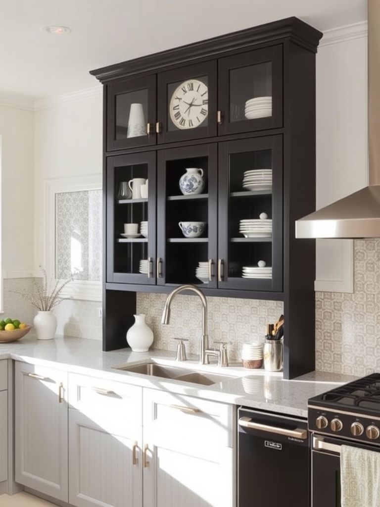 This decor idea features a fascinating mosaic of antique plates in various shapes and sizes, interspersed with stacks of vintage books, creating a rich tapestry of textures and colors above ivory kitchen cabinets. The unique blend of porcelain’s sheen and the aged leather of books offers a nostalgic charm, making it ideal for homeowners who cherish a blend of historical elegance with a personal touch in their kitchen space. This setup would particularly suit those with a love for collecting and displaying heirlooms, adding a conversation-starting element to their home.