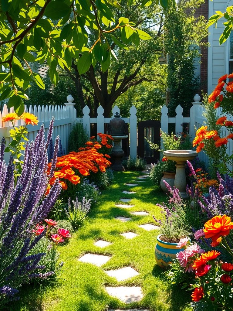 This small cottage garden features a charming stone pathway that meanders through lush greenery, leading the eye towards a burst of vibrant lavender in full bloom. The unique touch of whimsical fairy lights strung between the plants adds a magical evening glow, making this garden perfect for those who adore a blend of rustic charm and enchanting ambiance. Ideal for gardening enthusiasts who want to create a serene yet lively retreat, this setup invites relaxation and a touch of fairy-tale wonder.